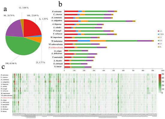 CAZymes in P. echinovolvatus and other fungi. (a) The distribution of CAZymes in P. echinovolvatus. (b) The distribution of CAZymes in another 23 fungi. (c) Heatmap representing the CAZyme families distributed in P. echinovolvatus and other fungi. GH, glycoside hydrolase; GT, glycosyltransferase; PL, polysaccharide lyase; CE, carbohydrate esterase; CBM, carbohydrate-binding module; AA, auxiliary activity. * Referenced [20,21]. The red font is the target species sequenced in this paper.
