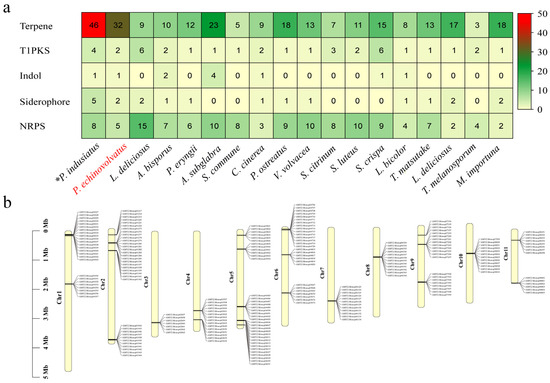 Secondary metabolite prediction results for P. echinovolvatus. (a) Comparison of the secondary metabolites of P. echinovolvatus with those of other fungi. (b) The distribution of gene clusters encoding sesquiterpenes on chromosomes. NRPS, non-ribosomal peptides; PKS, polisyketides. * Referenced [20]. The red font is the target species sequenced in this paper.