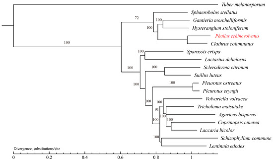 The evolutionary relationships between P. echinovolvatus and 18 other fungi (T. melanosporum from Ascomycota as the outgroup) were investigated. A total of 629 single-copy orthologous gene families were found and used to construct the phylogenetic tree, and 844 genes were unique to P. echinovolvatus (Table S11). As shown in Figure 7, P. echinovolvatus was nested within a large clade formed by five species under Phallales and clustered with C. columnatus, indicating that P. echinovolvatus is closely related to C. columnatus. P. echinovolvatus and C. columnatus both belong to the family Phallaceae, and the results of the phylogenetic analysis were consistent with the classification results based on the morphological and molecular traits.