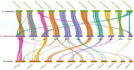 The genome collinearity among P. echinovolvatus, C. columnatus, and P. ostreatus. The red font is the target species sequenced in this paper.