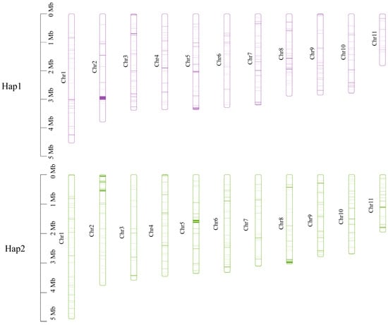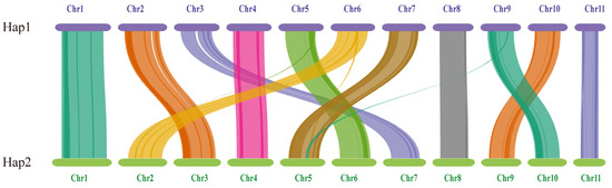 Subsequently, non-collinear gene sequences were extracted from the genome and subjected to blastn alignment for the two haplotypes (e-value < 1 × 10−5). There were 256 unique genes in Hap1 and 370 unique genes in Hap2. These unique genes were widely distributed across each chromosome, with a predominant location on chromosome 2 in Hap1 and on chromosomes 5 and 8 in Hap2 (Figure 10).