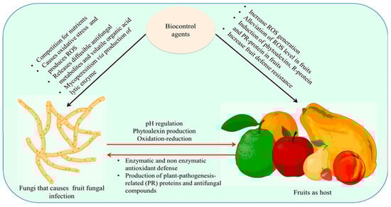 The relationship between biocontrol, pathogen, and host (mechanism of biocontrol action) is an intricate process consisting of multiple developments. The biocontrol agents impact fungal pathogens by instigating oxidative stress that triggers ROS, releases volatile organic acid and diffusible antifungal metabolites, and mycoparasitism via the production of lytic enzymes. In fruits, induction of phytoalexins R-protein and PR-protein and an upsurge in ROS generation lead to an increase in fruit defense resistance by antioxidant enzymes.