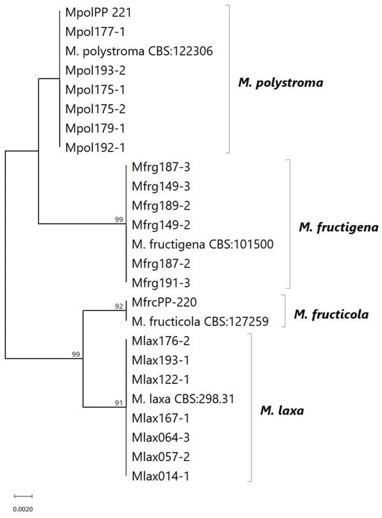 The identity of the four Monilinia species was confirmed through BLASTN analysis of the obtained ITS sequences against reference sequences in the NCBI GenBank database. The isolates clustered with the reference sequences of M. fructicola CBS 127259 (MH864497), M. fructigena CBS 101500 (MH862738), M. laxa CBS 298.31 (MH855219), and M. polystroma CBS 122306 (MH863200) [32]. No genetic differences were observed between strains originating from different geographic locations or host fruits within the same Monilinia species (Figure 1).