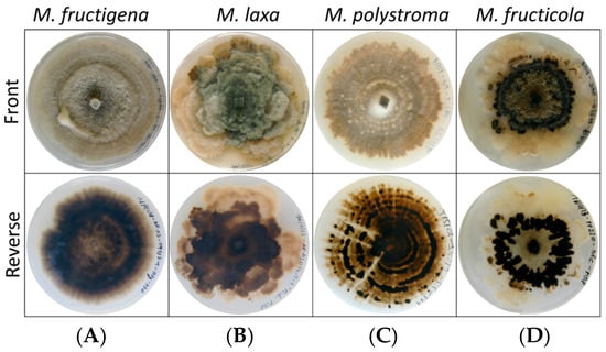 Samples assessed at 27 dpi of (A) M. fructigena strain 191_3, (B) M. laxa strain 14_1, (C) M. polystroma strain 192_1, and (D) M. fructicola strain PP_220 grown on PDA at 20 °C under a 12:12 h L:D photoperiod. Front and back of colony.