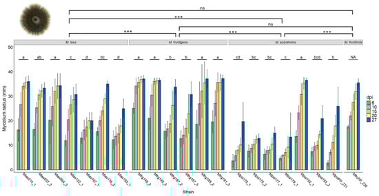 Mean mycelium radius (±SD; n = 5) of strains of M. fructigena, M. laxa, M. polystroma, and M. fructicola grown on PDA at 20 °C under a 12:12 h L:D photoperiod over 27 days. Different lowercase letters denote significant differences in growth between strains within the same Monilinia spp. (p < 0.05, n = 5). NA means no statistically different values. Asterisks denote significant differences between treatments (ns p > 0.05, *** p ≤ 0.001).