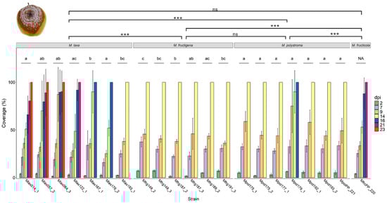 Mean coverage (±SD; n = 5) of strains of M. fructigena, M. laxa, M. polystroma, and M. fructicola on apples at 20 °C under a 12:12 h L:D photoperiod. Different lowercase letters denote significant differences in growth between strains within the same Monilinia spp. (p < 0.05, n = 5). NA means no statistically significant values. Asterisks denote significant differences between treatments (ns p > 0.05, *** p ≤ 0.001).
