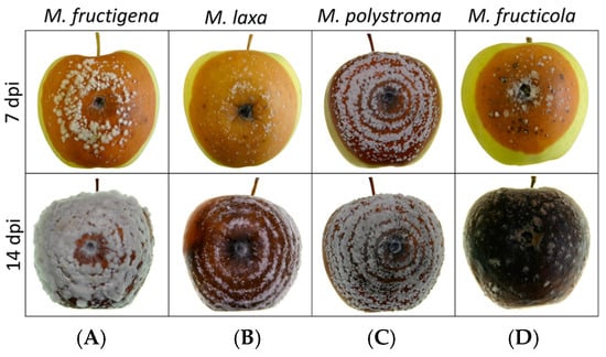 Samples assessed at 7 and 14 dpi of (A) M. fructigena strain 191_3, (B) M. laxa strain 14_1, (C) M. polystroma strain 192_1, and (D) M. fructicola strain PP_220 grown on apples at 20 °C under a 12:12 h L:D photoperiod.