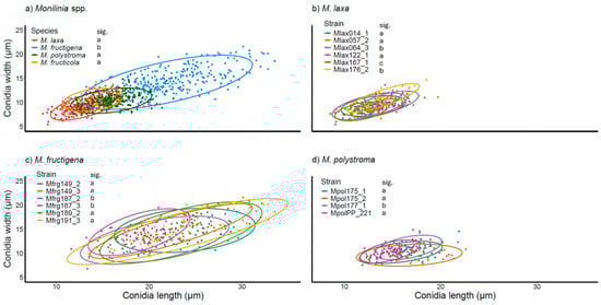 Conidia length and width (n = 50) of (a) Monilinia spp., (b) M. laxa strains, (c) M. fructigena strains, and (d) M. polystroma strains. Ellipses show 95% confidence level. Different lowercase letters indicate significant differences between species or strains (p < 0.05).