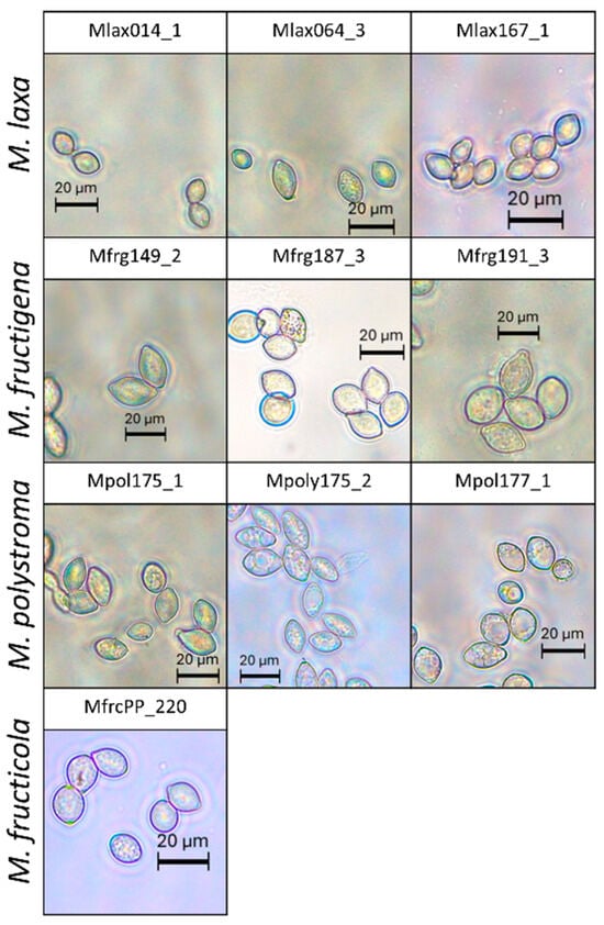 Brown rot, caused by Monilinia species, is one of the most important diseases in stone fruit orchards, both pre- and postharvest. Monilinia species are a significant threat to stone and pome fruit crops, particularly in temperate climates. The most important pathogens include Monilinia fructigena Honey, Monilinia laxa Honey, Monilinia polystroma L.M. Kohn, and Monilinia fructicola Honey [1]. All Monilinia species affect the flowers and twigs of stone fruit, causing blossom blight and cankers [2,3,4]. Additionally, the symptoms of brown rot appear on the stone fruit. Initially, small, superficial, brown circular spots are observed, which expand in diameter until they cover the entire fruit [5]. The fungus overwinters primarily in mummified fruits, which either remain on the trees or fall to the ground [6,7]. In pome fruit cultivation, Monilinia is mainly recognized as an important post-harvest pathogen [4,6]. However, brownish dieback has also been observed on the leaf petioles, laminas, and on small fruits and fruit pedicels of apple [8]. Since brown rot symptoms are caused by different closely related species, morphological characteristics of individual strains are crucial for distinguishing Monilinia species and understanding the consistency between strains.