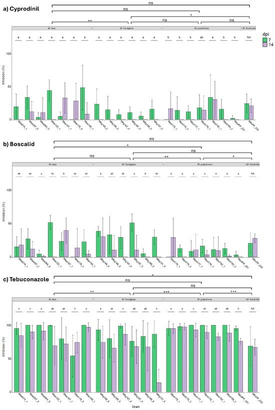 Mean inhibition (±SD; n = 5) of Monilinia spp. by (a) cyprodinil, (b) boscalid, and (c) tebuconazole on apples at 7 and 14 dpi. Means not sharing any letter are significantly different by the Tukey test (p < 0.05). Different lowercase letters denote significant differences in growth between strains within the same Monilinia species (p < 0.05, n = 5). NA means no statistical values. Asterisks denote significant differences between treatments (ns p > 0.05, * p ≤ 0.05, ** p ≤ 0.01, *** p ≤ 0.001).
