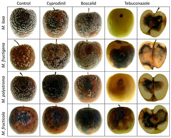 While apples treated with cyprodinil and boscalid showed mycelial growth and brown rot symptoms on the fruit surface, treatment with tebuconazole provided protection on the fruit surface, resulting in fungal spread and symptom development being concentrated in the fruit interior (Figure 9).