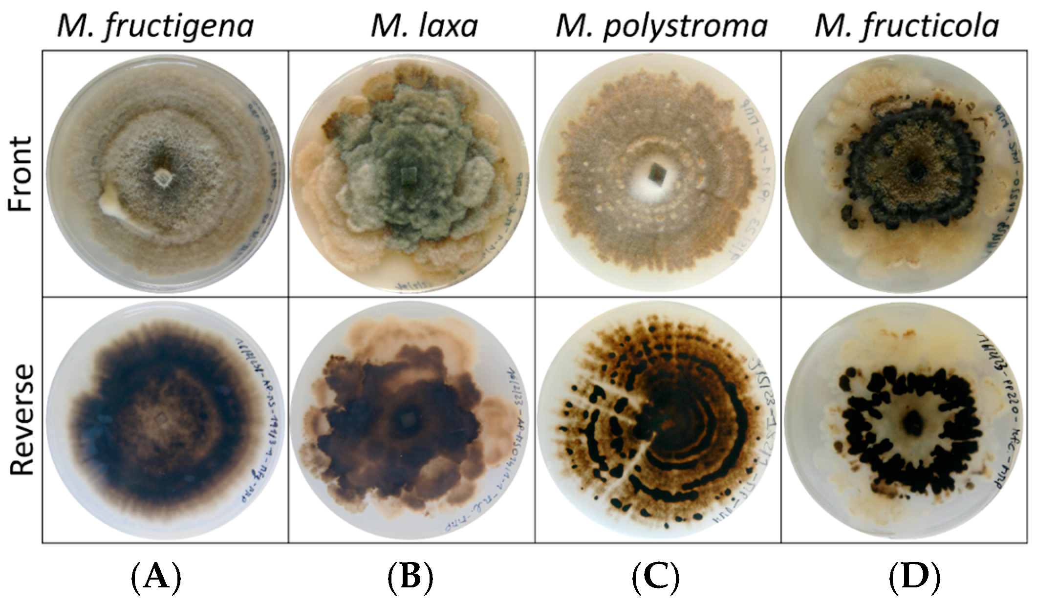 - Petróczy, M.; Szigethy, A.; Palkovics, L. Monilinia species in Hungary: Morphology, culture characteristics, and molecular analysis. Trees 2012, 26, 153–164. [Google Scholar] [CrossRef]