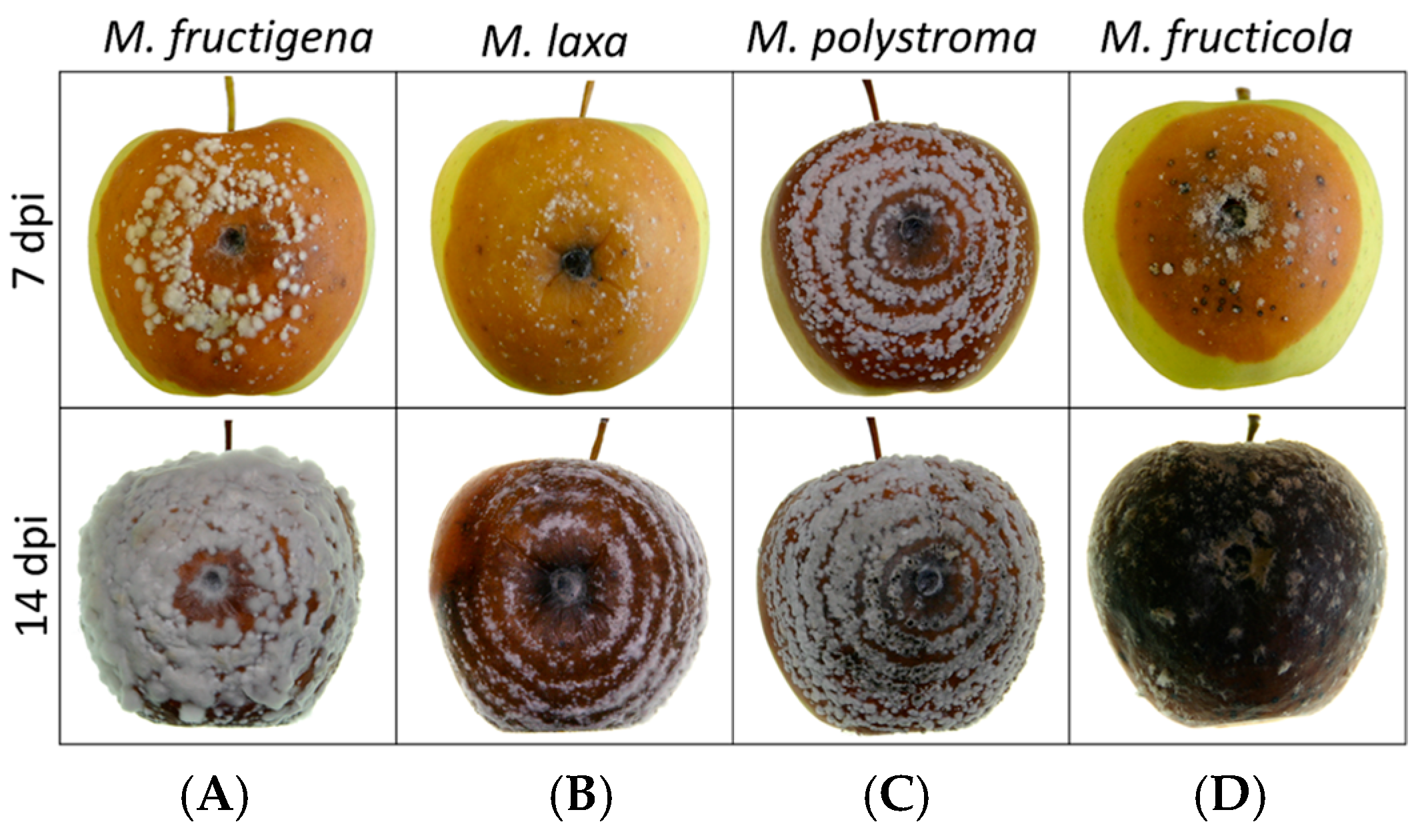 - Martini, C.; Mari, M. Monilinia fructicola, Monilinia laxa (Monilinia rot, brown rot). In Postharvest Decay; Academic Press: Cambridge, MA, USA, 2014; pp. 233–265. [Google Scholar] [CrossRef]