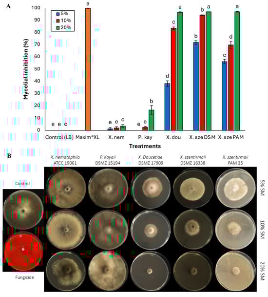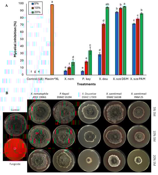 (A) Activities of cell-free supernatants at concentrations of 5%, 10%, and 20% on phytopathogenic fungi Macrophomina phaseolina. Data on mycelial growth area presented as mean mycelial inhibition ± standard error. The effects of each concentration were analyzed using ANOVA with Tukey’s test (p < 0.05). Different letters above the bars represent statistical differences at the tested concentrations. Abbreviations: Maxim®XL (fungicide), X. nem: Xenorhabdus nematophila, P. kay: Photorhabdus kayaii, X. dou: Xenorhabdus doucetiae, X. sze DSM: Xenorhabdus szentirmaii DSM 16338, X. sze PAM: Xenorhabdus szentirmaii PAM 25. (B) Inhibition of mycelial growth of the fungal pathogen Macrophomina phaseolina. at concentrations of 5%, 10%, and 20% of the respective bacterial cell-free supernatant.