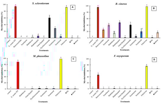 Activities of supernatants enriched with selected natural products produced by the respective easyPACId strains of Xenorhabdus doucetiae Δhfq on phytopathogenic fungi. Negative control: LB agar. (A) Sclerotinia sclerotiorum, (B) Botrytis cinerea, (C) Macrophomina phaseolina, (D) Fusarium oxysporum. Data on mycelial growth area presented as mean mycelial inhibition ± standard error. The effects of each concentration were analyzed using ANOVA with Tukey’s test (p < 0.05). Different letters above the bars represent statistical differences at the tested concentrations.