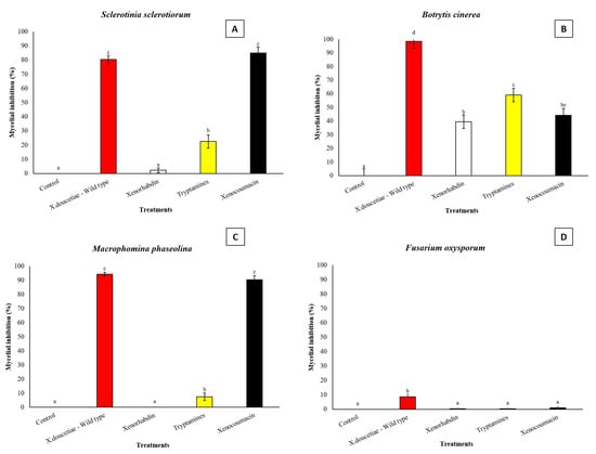 For X. doucetiae, four secondary metabolites were tested. Xenocoumacins significantly inhibited S. sclerotiorum (F = 173.988; df = 5, 119; p < 0.0001) and M. phaseolina (F = 740.804; df = 5, 119; p < 0.0001), achieving inhibition rates above 85.0%. This inhibition differed significantly from that of the other compounds but not from the positive control (X. doucetiae wildtype) (Figure 6A,C). All tested SMs produced by X. doucetiae (xenorhabdin, phenylethylamides, tryptamides, and xenocoumacin) inhibited B. cinerea mycelial growth by 38.7% to 59.1%, significantly lower than the X. doucetiae wildtype, which inhibited 98.5% (F = 46.956; df = 5, 119; p < 0.0001) (Figure 6B). Against F. oxysporum, all tested compounds showed minimal inhibitory activity, ranging from 0.35% to 1.02%, whereas X. doucetiae wildtype inhibited only 8.7%, significantly differing from the X. doucetiae mutants (F = 27.555; df = 5, 119; p < 0.0001) (Figure 6D).