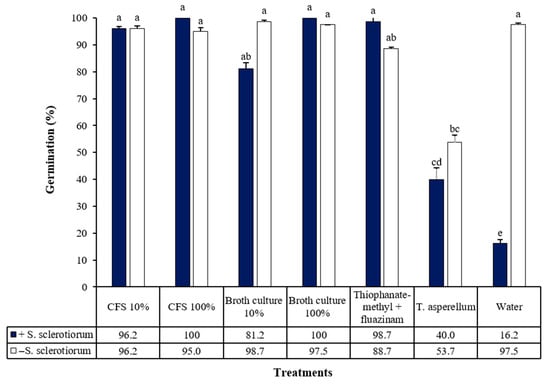 Seeds infected with Sclerotinia do not germinate or germinate poorly compared to healthy seeds. The evaluation consisted of counting the number of germinated seeds 10 days after the experiment setup. The data were expressed as the percentage of germinated seeds.