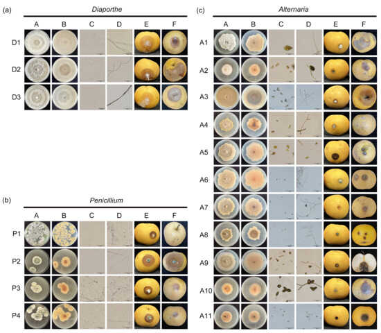 Figure 1. Morphological characteristics of fungal pathogens such as Diaporthe (a), Penicillium (b), and Alternaria (c) in rotten ‘Akizuki’ pears. A, front view of a purified pathogenic fungus colony. B, back view of a purified pathogenic fungus colony. C, conidia morphology, showing a typical characteristic of the pathogens. D, mycelium morphology showing a typical characteristic of the pathogens. E, inoculation symptoms of isolated and purified pathogens. F, original symptoms caused by the pathogen on fruit. The scale bar indicates 50 µm.