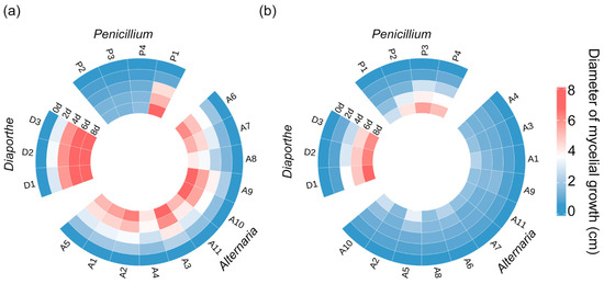 Figure 2. The infecting potential test for representative isolates of different pathogens. Heatmap depicting mycelial growth diameter of each strain on PDA (a) and pear fruits (b).