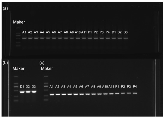 Figure 3. Gel electrophoresis image of PCR-amplified products. (a) ITS, (b) β-tub, and (c) tef1.