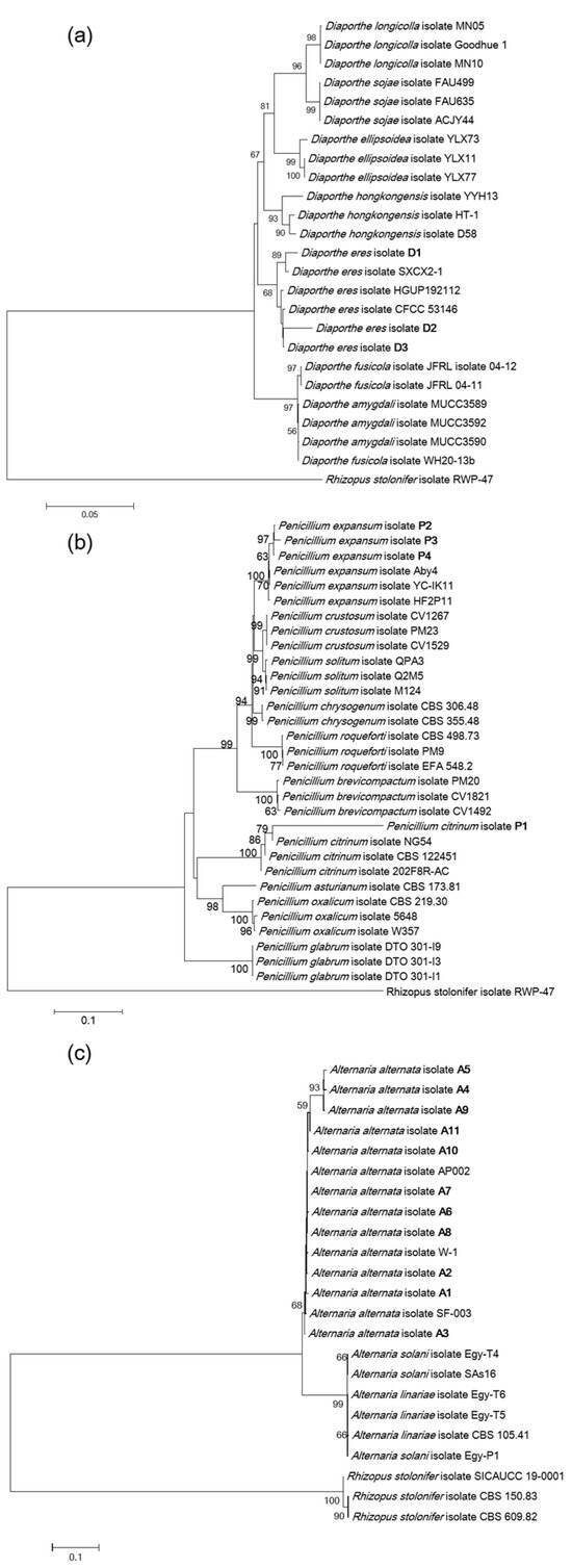Figure 4. Multi-locus phylogenic tree of the eighteen pathogenic fungal strains based on a Neighbor-Joining analysis. (a) Phylogenetic tree based on ITS and β-tub gene sequences of strains D1, D2, and D3. (b) Phylogenetic tree based on ITS and tef1 gene sequences of strains P1, P2, P3, and P4. (c) Phylogenetic tree based on ITS and tef1 gene sequences of strains A1-A11. The numbers on the nodes indicate the support percentages of bootstrap. The scales 0.005, 0.1, and 0.1 represent the branch difference length of evolution. The codes following the species names indicate the isolate or strain.
