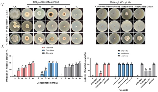 Figure 5. The effect of different concentrations of ClO2 and multiple fungicides on mycelial growth of P. expansum, A. alternata, and D. eres in vitro. (a) Mycelial growth. (b) Inhibition of mycelial growth. Error bars represent vertical bars(n = 6 for inhibition of mycelial growth). Different letters indicate significant differences according to Duncan’s test (p < 0.05).