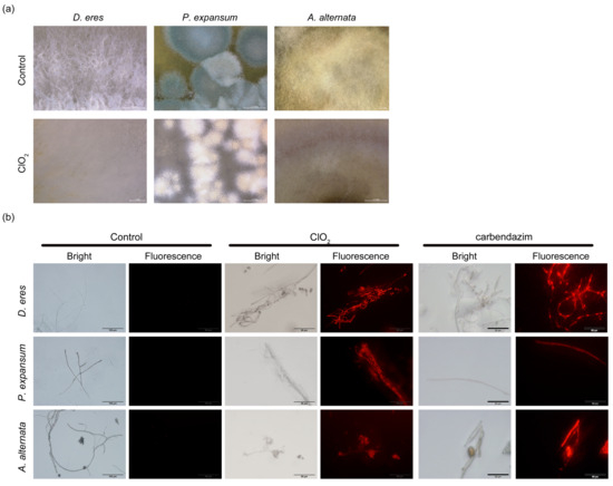 Figure 6. The effect of ClO2 on the growth of P. expansum, A. alternata, and D. eres. (a) Super-depth-of-field microscope (SDM) images of P. expansum, A. alternata, and D. eres without ClO2 treatment and treated with 45 mg/L of ClO2. (b) Effect of chlorine dioxide treatment on mycelial cell membranes of P. expansum, A. alternata, and D. eres. The scale bar indicates 50 µm.