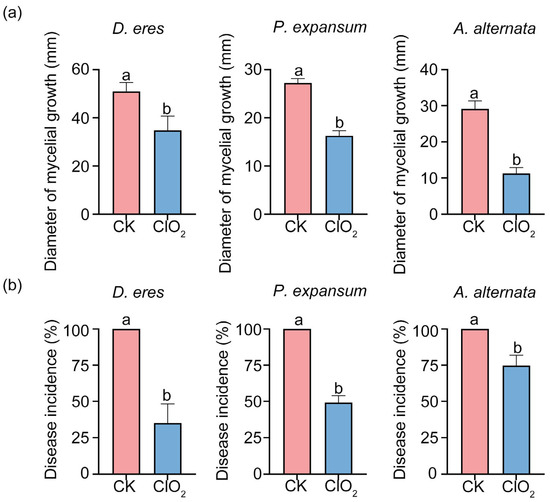 Figure 7. Effect of ClO2 (45 mg/L) on lesion length (a) and disease incidence (b) caused by P. expansum, A. alternata, and D. eres in pears after 3 days of storage at 25 °C. Vertical bars represent standard deviations of the means. Error bars represent vertical bars (n = 9). Different letters indicate significant differences according to Tukey’s test (p < 0.05).