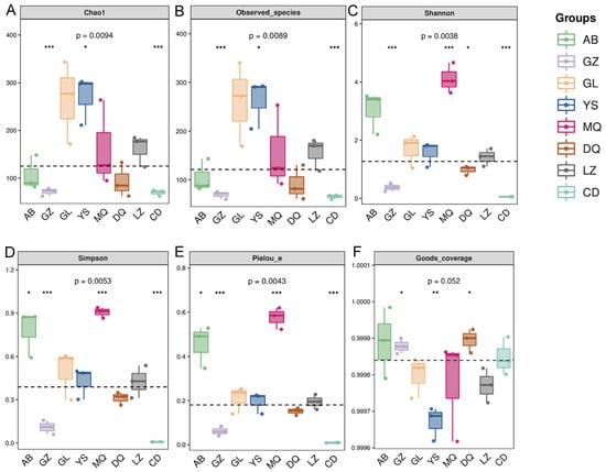 Alpha diversity indices of fungal communities in the mycosphere soil of O. sinensis from different geographical regions. (A) Chao1 index; (B) Observed species index; (C) Shannon index; (D) Simpson index; (E) Pielou species evenness index; (F) Good’s coverage (* p < 0.05, ** p < 0.01, *** p < 0.001).