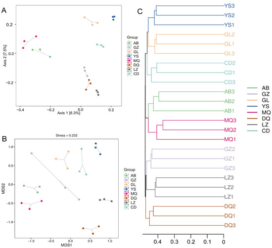 Beta diversity analysis of fungal communities in the mycosphere soil of O. sinensis from different geographical regions. (A) PCoA analysis; (B) NMDS analysis; (C) UPGMA analysis.