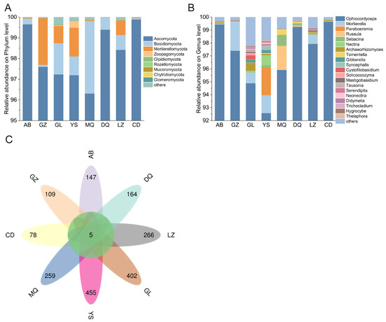 At the genus level, Ophiocordyceps was predominant in all soil samples, accounting for 92.58% (YS) to 99.65% (CD) of the total fungal community. In addition to Ophiocordyceps, Mortierella was present across multiple sites, although its abundance was consistently lower than that of Ophiocordyceps. The highest abundance of Mortierella was observed in GZ (2.25%), while the lowest was in CD (0.25%). Comparative analysis of the genus-level composition revealed higher fungal diversity in the GL and YS regions. In GL, genera with a relative abundance greater than 0.3% included Ophiocordyceps, Mortierella, Archaeorhizomyces, and Cystofilobasidium. In YS, the dominant genera (relative abundance > 0.3%) were Ophiocordyceps, Mortierella, Paraboeremia, Nectria, and Syncephalis. Certain genera exhibited regional specificity in their abundance. For example, Russula showed the highest abundance exclusively in MQ (1.84%); Sebacina peaked in DQ (0.15%), and Archaeorhizomyces had the highest abundance in CD (0.52%) (Figure 3B).