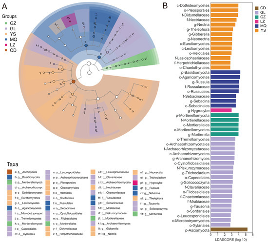 Biomarkers in different samples were identified through LEfSe analysis. (A) Linear discriminant analysis (LDA) of mycosphere soil fungi associated with O. sinensis from different geographical regions. (B) Comparisons of the different groups of soil fungi with LDA score > 3, p < 0.05.