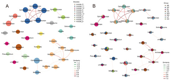 To identify the dominant fungal taxa in the mycosphere networks of O. sinensis across different regions, only ASVs with a total sequence count ≥ 10 and present in at least five samples were retained. Based on these filtered ASVs, a correlation matrix was constructed using the SparCC algorithm to reveal potential co-occurrence patterns among fungal taxa, based on R > 0.7 and p < 0.05. At the phylum level, the network consisted of three major fungal phyla: Ascomycota, Basidiomycota, and Mortierellomycota (Figure S3). These phyla were distributed across 10 network modules (Figure 5A). Ophiocordyceps was exclusively distributed in Module 11 and Module 12. Module 11 comprised samples from MQ and AB, while Module 12 included samples from GL and AB. A strong positive correlation was observed between the node degrees of these two modules. In addition, Ophiocordyceps in Module 12 showed negative correlations with Sebacina, involving samples from YS, MQ, and DQ. Module 3 was composed of Ophiocordyceps, which showed positive correlations in samples from LZ and DQ, and negative correlations with Solicoccozyma in samples from GL and YS. Module 5 contained both Ophiocordyceps and Mortierella, spanning all sample groups. Module 9 included Mortierella, Archaeorhizomyces, and Acicuseptoria, and was primarily associated with samples from YS, GL, and CD. A negative correlation was detected between Module 9 and Module 2, where Module 2 encompassed samples from all regions and was composed of Ophiocordyceps and Mortierella (Figure 5B). In summary, based on its high degree and high betweenness, Ophiocordyceps emerged as the core taxon in the mycosphere fungal communities of O. sinensis across all regions, playing a central and potentially driving role in shaping the structure of the fungal networks.