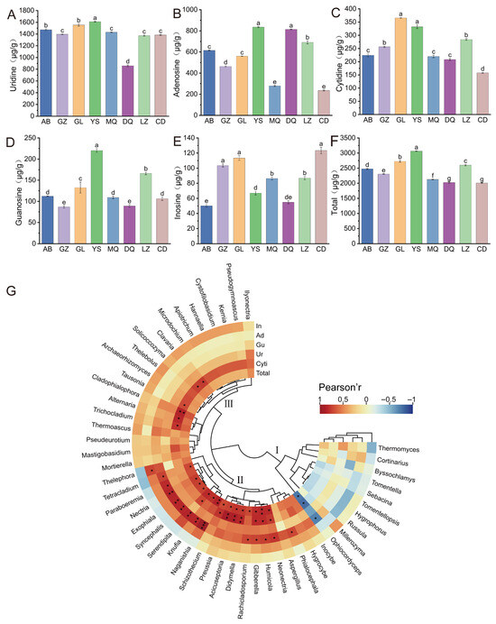 (A) Uridine, (B) adenosine, (C) cytidine, (D) guanosine, (E) inosine, (F) total nucleoside content; (G) correlation analysis between the top 50 most abundant fungal genera in the mycosphere soil of O. sinensis from different geographical regions and the nucleoside content of O. sinensis (* p < 0.05, ** p < 0.01, *** p < 0.001). Different lowercase letters indicate significant differences.