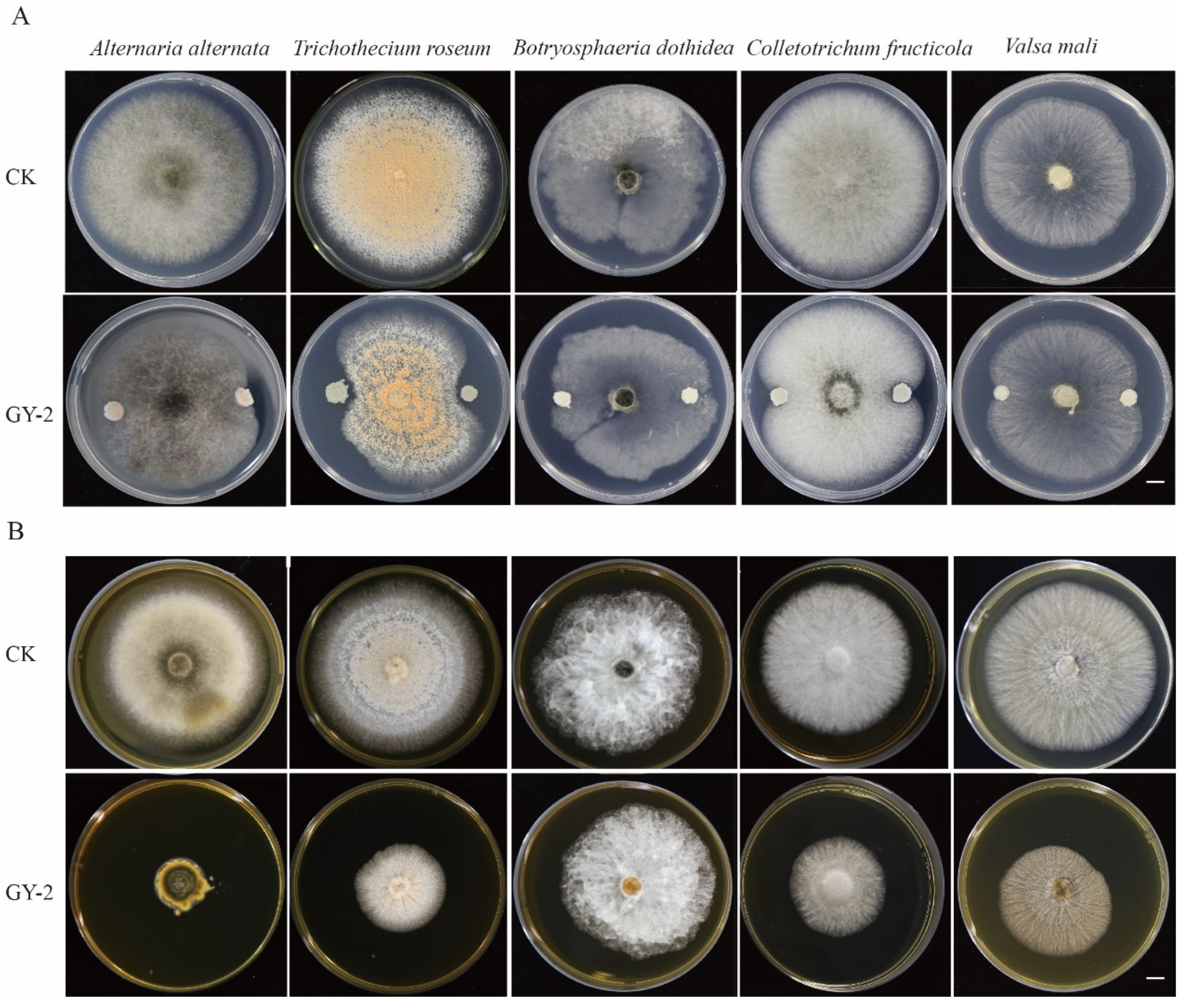 2.3. Assessment of the Inhibitory Activity of Strain GY-2 Against Apple Pathogens In Vitro