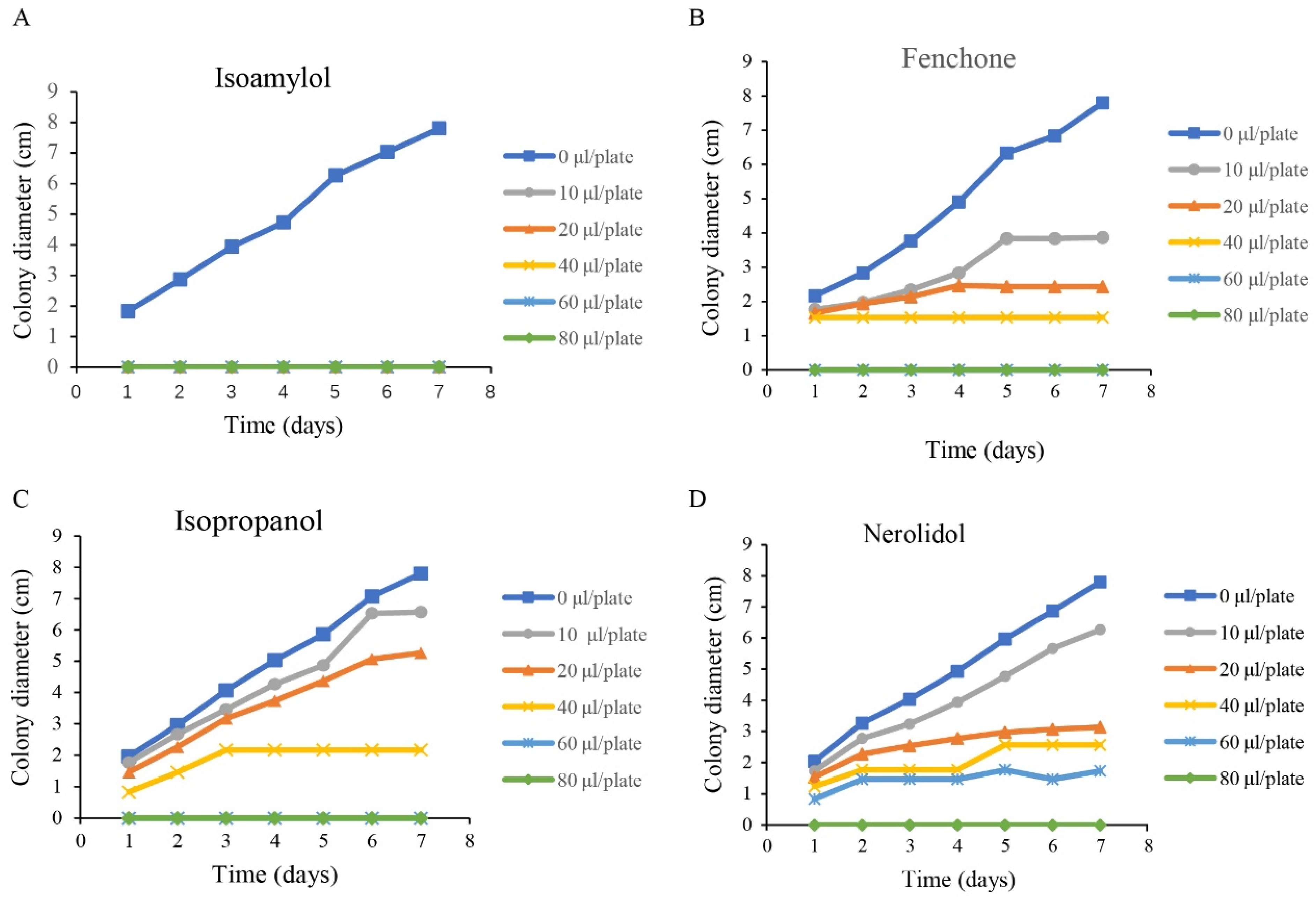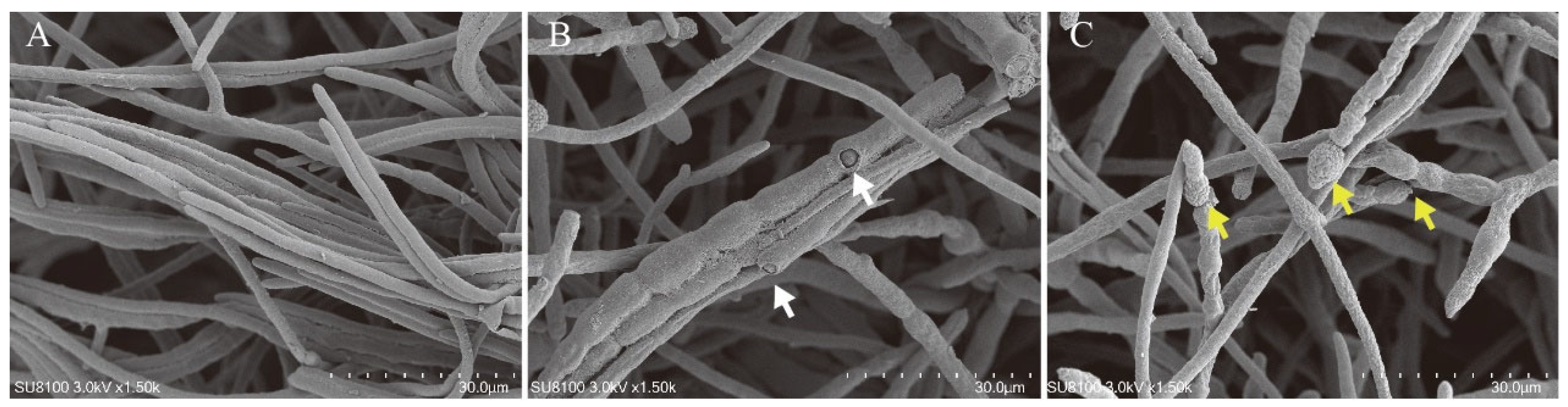 - Xing, S.; Gao, Y.; Li, X.; Ren, H.; Gao, Y.; Yang, H.; Liu, Y.; He, S.; Huang, Q. Antifungal activity of volatile components from Ceratocystis fimbriata and its potential biocontrol mechanism on Alternaria alternata in postharvest cherry tomato fruit. Microbiol. Spectr. 2023, 11, e02713–e02722. [Google Scholar] [CrossRef]