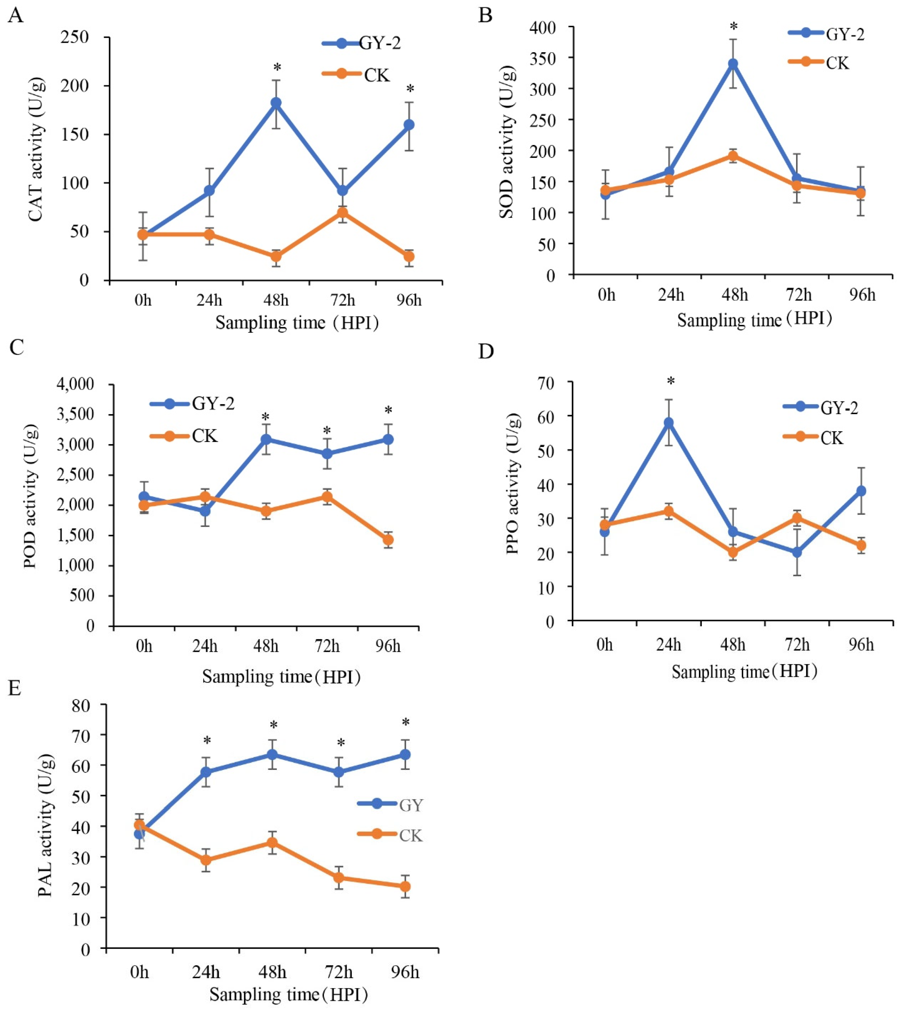 2.10. Effect of Strain GY-2 on Defense-Related Enzyme Activities