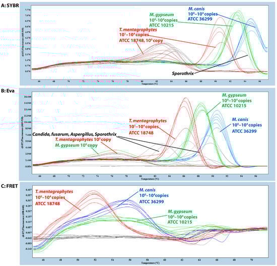 Melting-temperature-based differentiation of three dermatophyte species in SYBR Green, EvaGreen, and FRET-based qPCRs. All assays targeted the CHS1 gene region, with melting temperature (Tm) determined by HRM analysis from 45 °C to 80 °C. Testing included synthetic gBlocks (100–104 copies per reaction), ATCC reference strains, clinical isolates, and non-dermatophyte controls (Nocardia asteroides, Aspergillus spp., Fusarium, Sporothrix schenckii, and Candida spp.). (A) SYBR-Green-based qPCR: Microsporum canis (blue) and Nannizzia gypsea (green) showed consistent detection across all dilutions (100–104 copies). Trichophyton mentagrophytes (red) exhibited inconsistent detection and variable Tm values in 100 copies and ATCC strains. Non-specific melting peaks were observed in most non-dermatophyte controls (grey). (B) EvaGreen-based qPCR: Detection sensitivity varied by species: M. canis (blue) detected from 100–104 copies, while N. gypsea (green) and T. mentagrophytes (red) were reliably detected only from 104–101 copies. All ATCC strains were consistently detected; however, T. mentagrophytes showed reduced peak intensity. Non-specific peaks occurred in non-dermatophyte controls (grey). (C) FRET-based qPCR: All three species showed distinct, consistent Tm values: T. mentagrophytes (red, ~51.8 °C), M. canis (blue, ~56.1 °C), and N. gypsea (green, ~53.0 °C). Complete detection across all dilutions (104–100 copies) with ATCC strains matching synthetic gBlock profiles. No cross-reactivity detected in non-dermatophyte controls (grey).