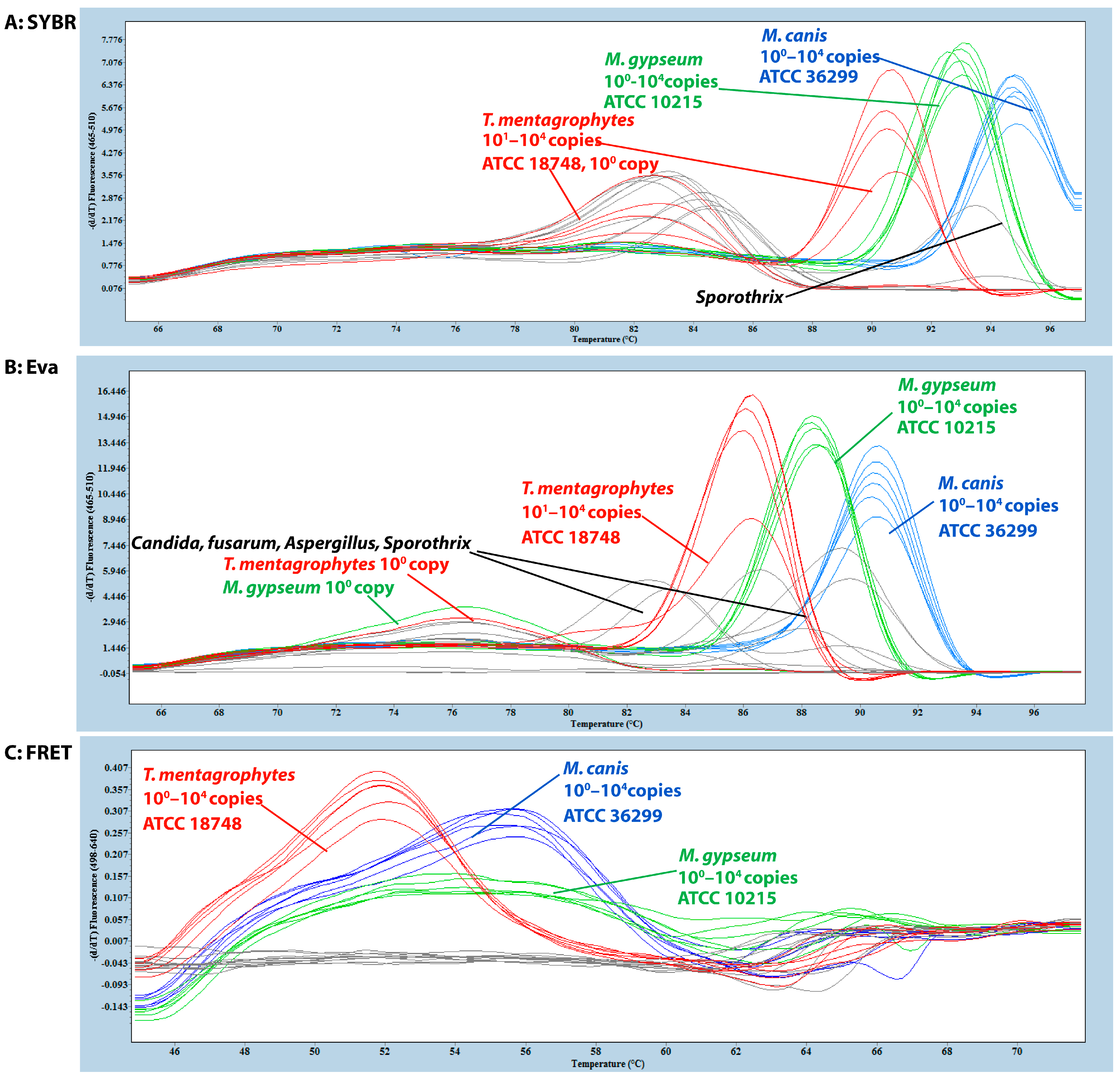 Chicago/Turabian StyleIduu, Nneka Vivian, Rae Kantzler, Donna Raiford, Brenda Bixler, Kelly Chenoweth, and Chengming Wang. 2025. "Dual-Emission FRET-PCR Outperforms SYBR Green and EvaGreen for Accurate Discrimination of Primary Canine Dermatophytes: Microsporum canis, Nannizzia gypsea, and Trichophyton mentagrophytes" Journal of Fungi 11, no. 10: 708. https://doi.org/10.3390/jof11100708