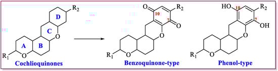 Cochlioquinones are a member of meroterpenoids, which was first found from red clover pathogen causing leaf spot diseases. Recently, numerous studies confirmed that different plant pathogens and endophytic fungi could produce cochlioquinones [12,13,14,15,16,17,18,19,20,21,22,23,24,25,26,27,28,29,30,31,32,33,34,35,36,37,38,39,40,41,42,43,44,45,46,47,48]. This group of meroterpenoids are polyketide-terpenoid hybrid molecules, featuring a core 6/6/6/6 tetracyclic ring system consisting of a sesquiterpenoid part and a polyketide part. Different post-modifications including esterification, oxidation, hetero cyclization, and also rearrangement and spontaneous oxidation, which leads to formation of diverse cochlioquinone analogues [12,13,14,15,16,17,18,19,20,21,22,23,24,25,26,27,28,29,30,31,32,33,34,35,36,37,38,39,40,41,42,43,44,45,46,47,48]. Up to date, there are eighty-one analogues isolated from different fungi. According to structural features at the polyketide part, cochlioquinones can be mainly categorized into two classes: benzoquinone-type cochlioquinones (with carbonyl group at C-7 or C-10) and phenol-type cochlioquinones (with hydroxyl group at C-7 or C-10), respectively (Figure 1).