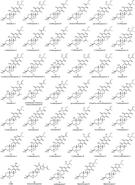 While several reviews have summarized the structures and bioactivities of meroterpenoids in general [1,4], a dedicated analysis focusing on the chemistry and biology of cochlioquinones has been lacking. This review systematically summarizes research on cochlioquinones from 1968 to 2024 (Table 1), aiming to facilitate future exploration and potential applications of these compounds in agricultural and pharmaceutical contexts.