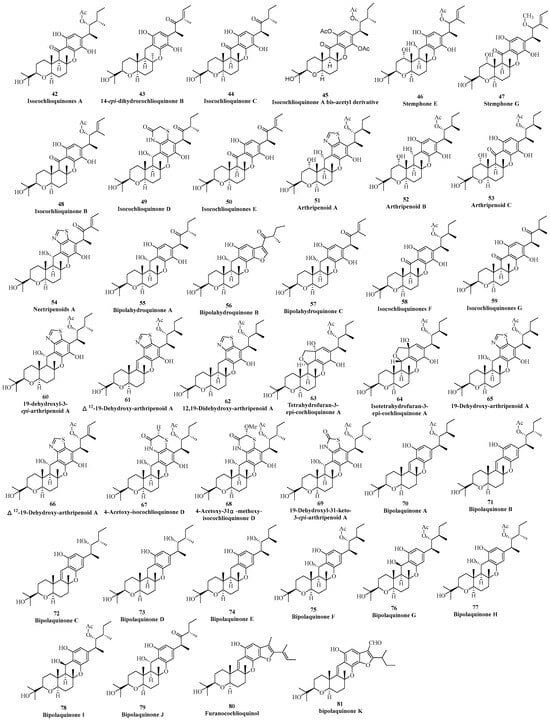 Cochlioquinones isolated from natural sources. Compounds 1–41 are classified as benzoquinone-type cochlioquinones, while compounds 42–81 are categorized as phenol-type cochlioquinones.