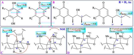 Usually, chemical shift values of a proton or a carbon is the reflection of electronic cloud density, which is mainly affected by chemical environments around (namely different groups or different configurations). As mentioned above, cochlioquinones can be classified into two types: benzoquinone-type and phenol-type. Analysis of the 1H-NMR spectral data in all benzoquinone-type and phenol-type cochlioquinones demonstrates that the 1H-NMR chemical shift value of H-11 in benzoquinone-type is over 6.40, whereas the value in phenol-type is lower 6.40 (in CDCl3) (Figure 4) [12,13,14,15,16,17,18,19,20,21,22,23,24,25,26,27,28,29,30,31,32,33,34,35,36,37,38,39,40]. Thus, it could judge whether an unknown cochlioquinone is the benzoquinone-type or the phenol-type based on the 1H-NMR chemical shift value of H-11.