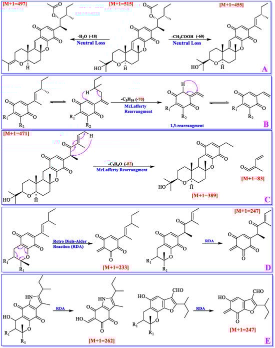 The mass fragmentation patterns of cochlioquinones were recently analyzed by Ding’s group [40]. The results revealed that neutral loss (H2O, and acetic acid), McLafferty rearrangement, and Retro Diels–Alder (RDA) reactions were found to be the main fragmentation patterns.