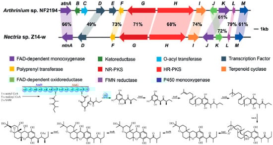 Two polyketide-terpenoid hybrid molecules (PK-TPs) gene clusters encoding polyketide synthase, prenyl-transferase, terpenoid cyclase and other tailoring enzymes (potent cochiloquinone biosynthetic gene cluster) were found based on bioinformatic analysis when Ge’s group analyzed the genomes of two phylogenetically distinct fungi Arthrinium sp. NF2194 and Nectria sp. Z14-w. Both these fungi could produce cochiloquinones through media optimization and reverse-transcription PCR analysis, though cochiloquinones from Nectria sp. Z14-w could not possess acetyl group on the polyketide part, which was completely consistent with comparable gene cluster analysis by absence of the O-acyl transferase in the cochiloquinones gene cluster of Nectria sp. Z14-w [28]. Then the specific function of each enzyme in the gene cluster of cochiloquinones was characterized by gene deletion, heterologous expression and enzymatic catalysis in vitro. For example, AtnH was responsible for synthesis of the polyketide parts due to the absence of cochiloquinones through by knock-out study, which was also supported by heterologous expression of AtnH/AtnG to produce two polyketide compounds. AtnF was suggested to be a membrane-bound prenyl-transferase by introducing a farnesyl group to the polyketide intermediate, and cochiloquinones were then absent after the genetic inactivation of atnF. The gene AtnI was suggested to encode a terpenoid cyclase, which might initiate the sequential tricyclic ring (6/6/6-tricyclic ring) formation through protonation of the terminal expoxide. The products as polyketides combined with a farnesyl group from ΔatnI mutant supported the above-mentioned conclusion. In addition, the authors also investigated the functions of the P450 oxygenase, and O-acyl transferase through enzymatic catalysis in vitro. Many cochiloquinones analogues are postulated to be artificial products through spontaneous oxidation, tautomerization, and rearrangements (Figure 7) [28].
