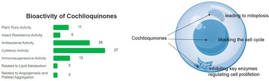 The major biological activities of cochlioquinones include cytotoxic, antibacterial, antifungal, insecticidal, and plant growth-regulating effects (Figure 9). While some structure-activity relationships (SARs) have been elucidated, the precise mechanisms underlying their inhibition of bacteria, fungi, and insects remain poorly understood and warrant further investigation.