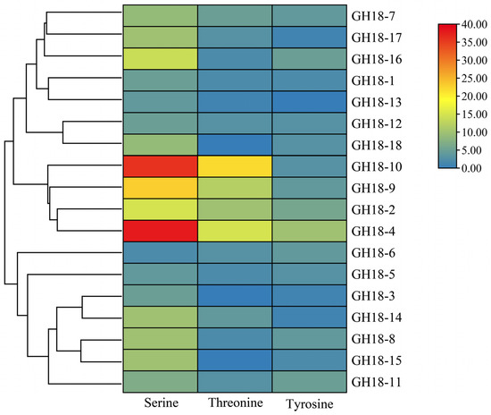 Based on the genomic data of T6, a total of 20 protein sequences containing the glycoside hydrolase family 18 catalytic domain (PF00704) were identified using a Hidden Markov Model (HMM) with an e-value threshold of 1 × 10−8. By integrating genome annotation data and utilizing TBtools software, the domain integrity of the predicted proteins was further validated through comparisons with the GH18 sequences of T. reesei and the SMART database. Ultimately, 18 members were confirmed to belong to the GH18 family genes in T6. These genes were designated as GH18-1 to GH18-18 based on their chromosomal localization. The ORF of the GH18 family members varied in length from 966 to 4512 bp, encoding peptides ranging from 321 to 1503 amino acids (Table 1). This length variation was primarily attributed to the presence of a C-terminal serine/threonine kinase domain. Physicochemical property analysis revealed that the GH18 proteins exhibited molecular weights from 34.53 to 159.28 kDa, with theoretical isoelectric points (pI) ranging from 4.20 to 6.20. According to the instability index, 10 members (index < 40) were predicted to be stable proteins, while the remaining 8 members (index 40.03 to 46.59) were classified as unstable. The aliphatic index varied from 64.18 to 90.38, indicating significant differences in thermal stability among the family members. Except for GH18-6, which displayed a positive grand average of hydropathicity (GRAVY) value, all other proteins had negative GRAVY values (−0.592 to −0.031), categorizing them as typical hydrophilic proteins. Transmembrane domain prediction indicated that none of the GH18 proteins possessed transmembrane helices. Given that signal peptides are crucial for determining secretion capacity in chitinases, further analysis identified 11 members (GH18-3, GH18-4, GH18-6, GH18-8, GH18-10, GH18-11, GH18-12, GH18-14, GH18-15, GH18-16, GH18-17) that contained signal peptides, while the remaining 7 members lacked them. Subcellular localization predictions indicated that all GH18 proteins, except for GH18-1 and GH18-13, which localized to mitochondria, were extracellular (Table 1). Phosphorylation site prediction (Figure 1) confirmed the presence of multiple potential phosphorylation sites across all GH18 proteins.