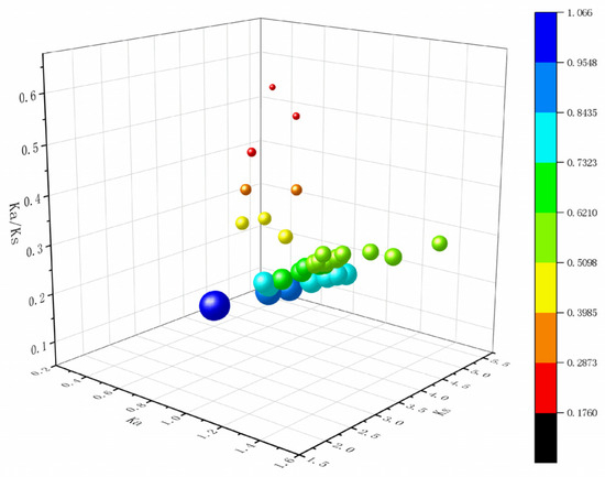 Evolutionary selection pressure analysis of GH18 homologous gene pairs. The X-axis represents the Ka value, the Y-axis represents the Ks value, and the Z-axis represents the ratio of Ka to Ks. The color scale represents the fold change normalized by log2-transformation of the data.