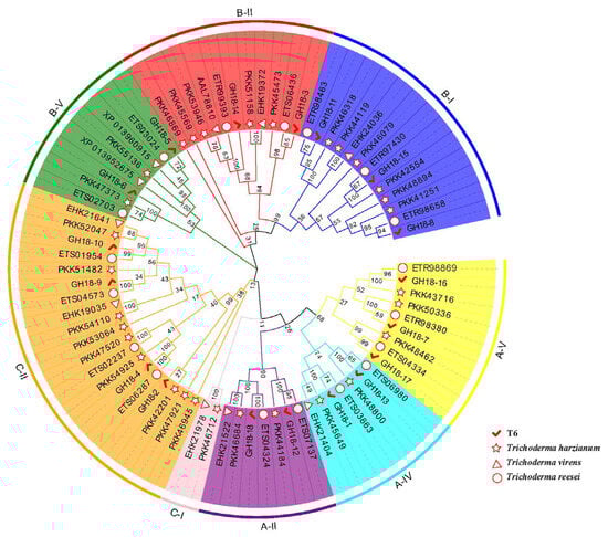 The phylogenetic tree was constructed using the neighbor-joining (NJ) method with MEGA11 (v11.0.13), based on the amino acid sequences of T6, T. harzianum, T. virens, and T. reesei. Putative GH18 proteins were identified in these species based on the results of an HMM search for PF00704. Furthermore, these proteins were classified into three major groups (A, B, and C) and eight subgroups (A-II, A-IV, A-V; B-I, B-II, B-V; C-I; C-II).