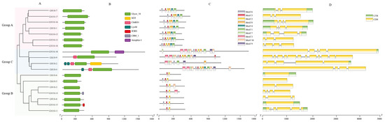 Analysis of the gene structure of 18 GH18 family members. (A) Phylogenetic tree. Different colors (Red, blue, and green) indicate different groups. (B) Domain defined using the PFAM database. (C) Motif analysis. The length and different colors of boxes denote motif length and different motifs, respectively. (D) Gene structure. CDS denotes exons.